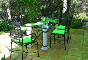 Beide Terrassen am Wohn- / Essbereich mit großem Tisch und je 6 Stühlen